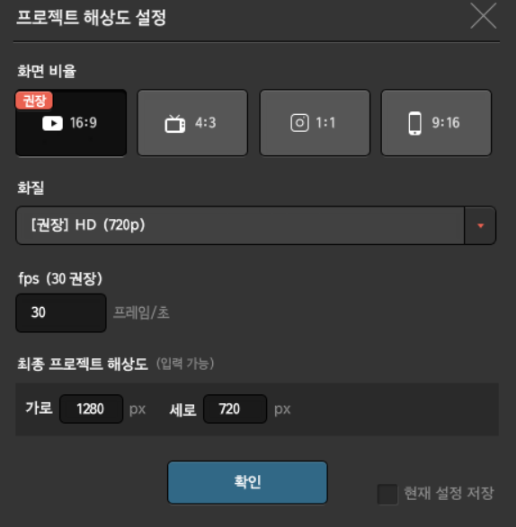 [새 프로젝트 만들기]를 클릭하고 영상의 화질을 선택합니다.